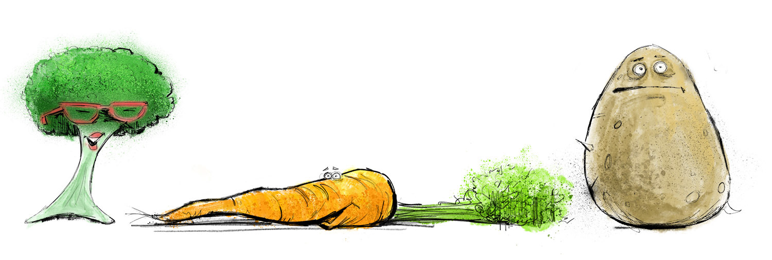 Various roots for a number of fruit and vegetable characters for a catering company's interactive School menu.