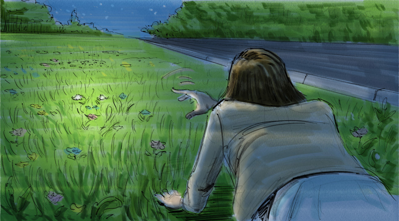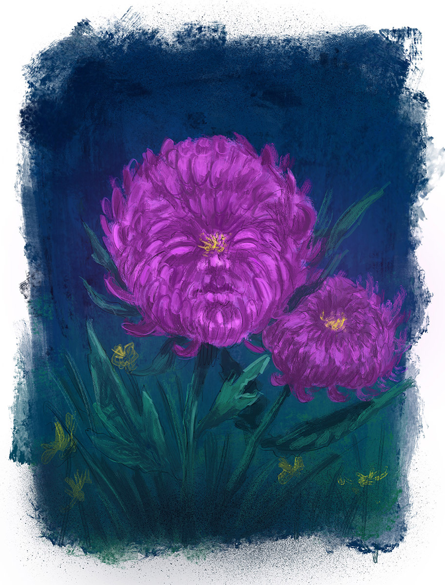 Concept art for a visual effects sequence in the dramatic short Olga? (2009) written and directed by Ilaria D'elia. The scene called for the main character to hallucinate the face of her child in a flower. We explored the possibility of the child's face being formed by the petals of a chrysanthemum, by the morphing of the pattern on a pansy and by the the movement of grass and flowers over a larger area.