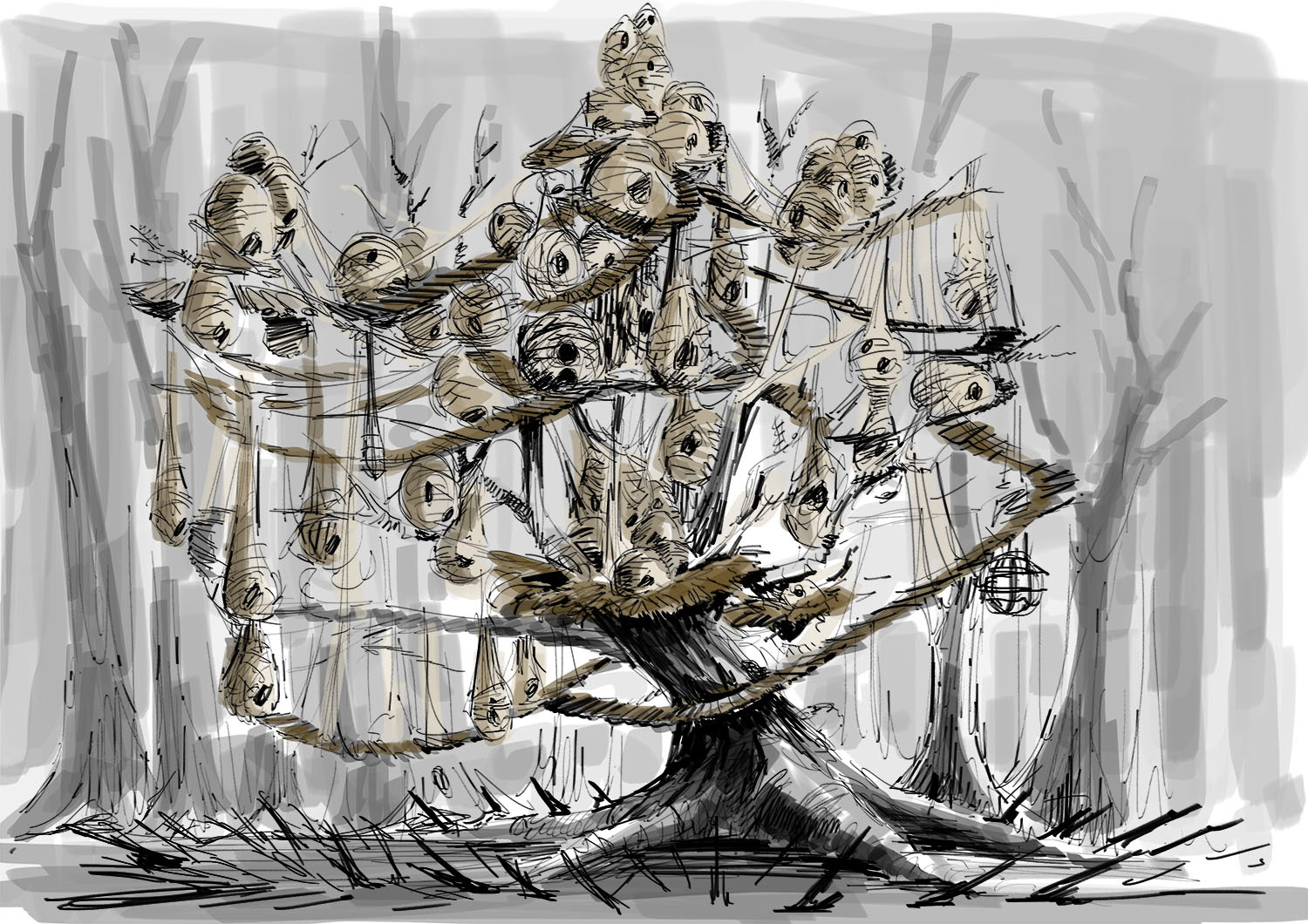 Below: Initial ideas for exterior and interior of the bad guy's treetop lair
