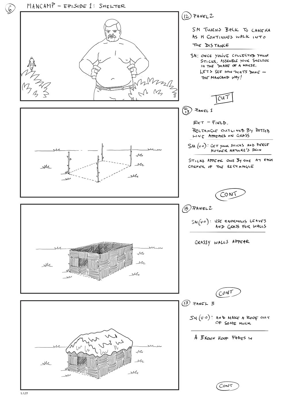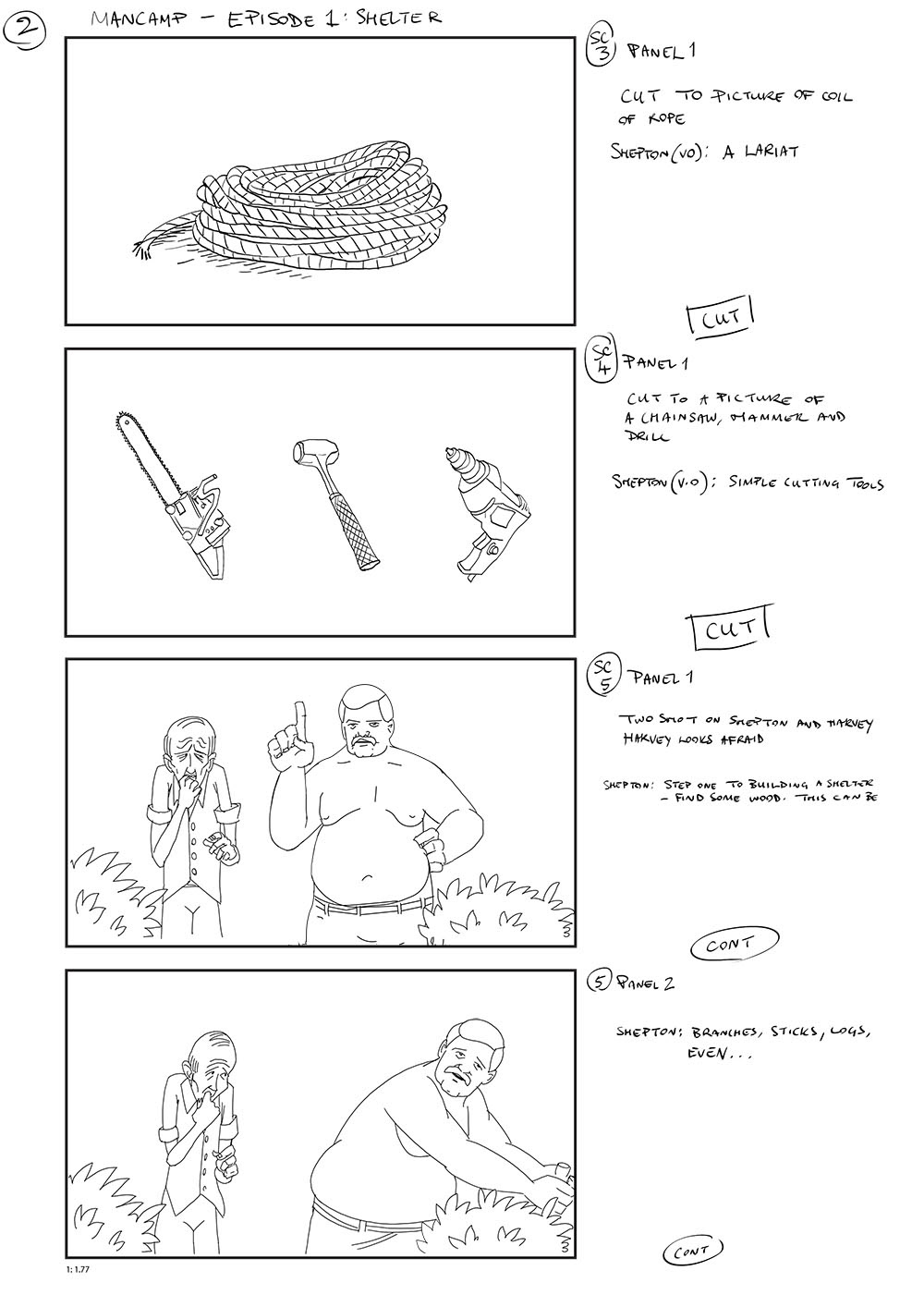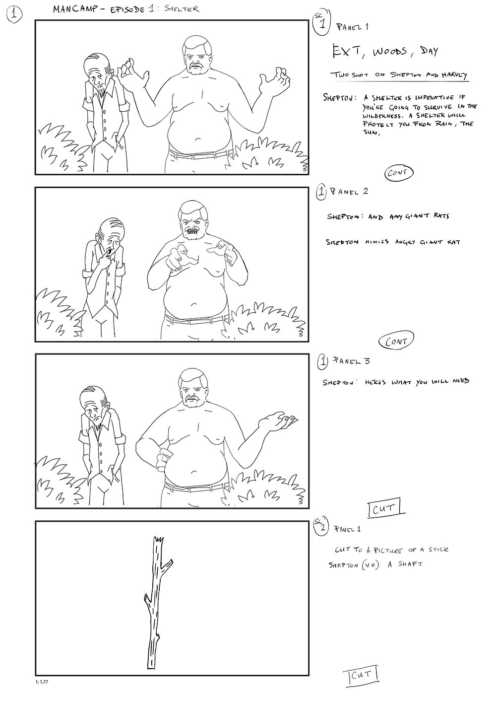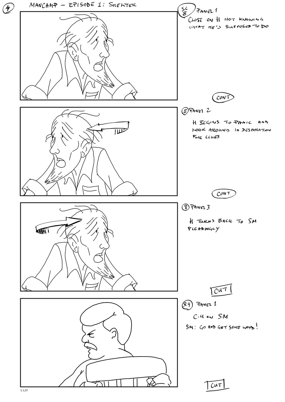 Sample boards for an adult comedy animation pitch lampooning survival shows like those of Bear Grylls and Ray Mears
