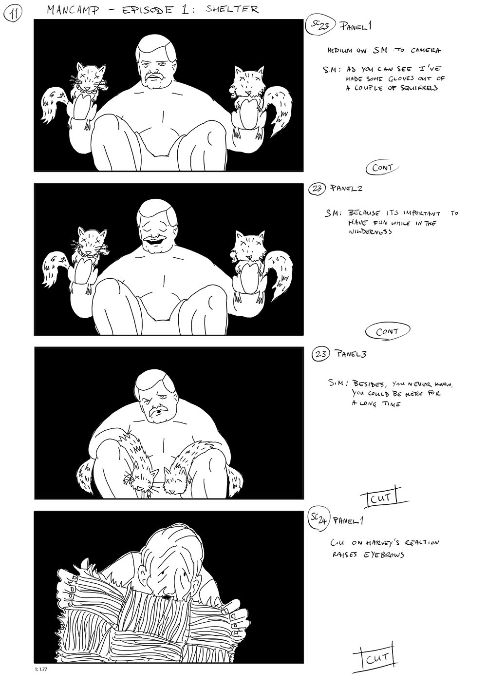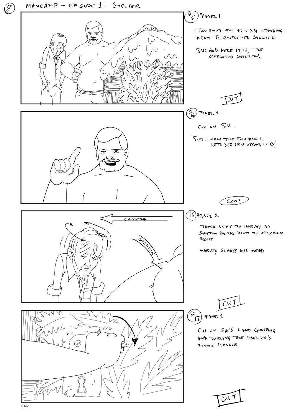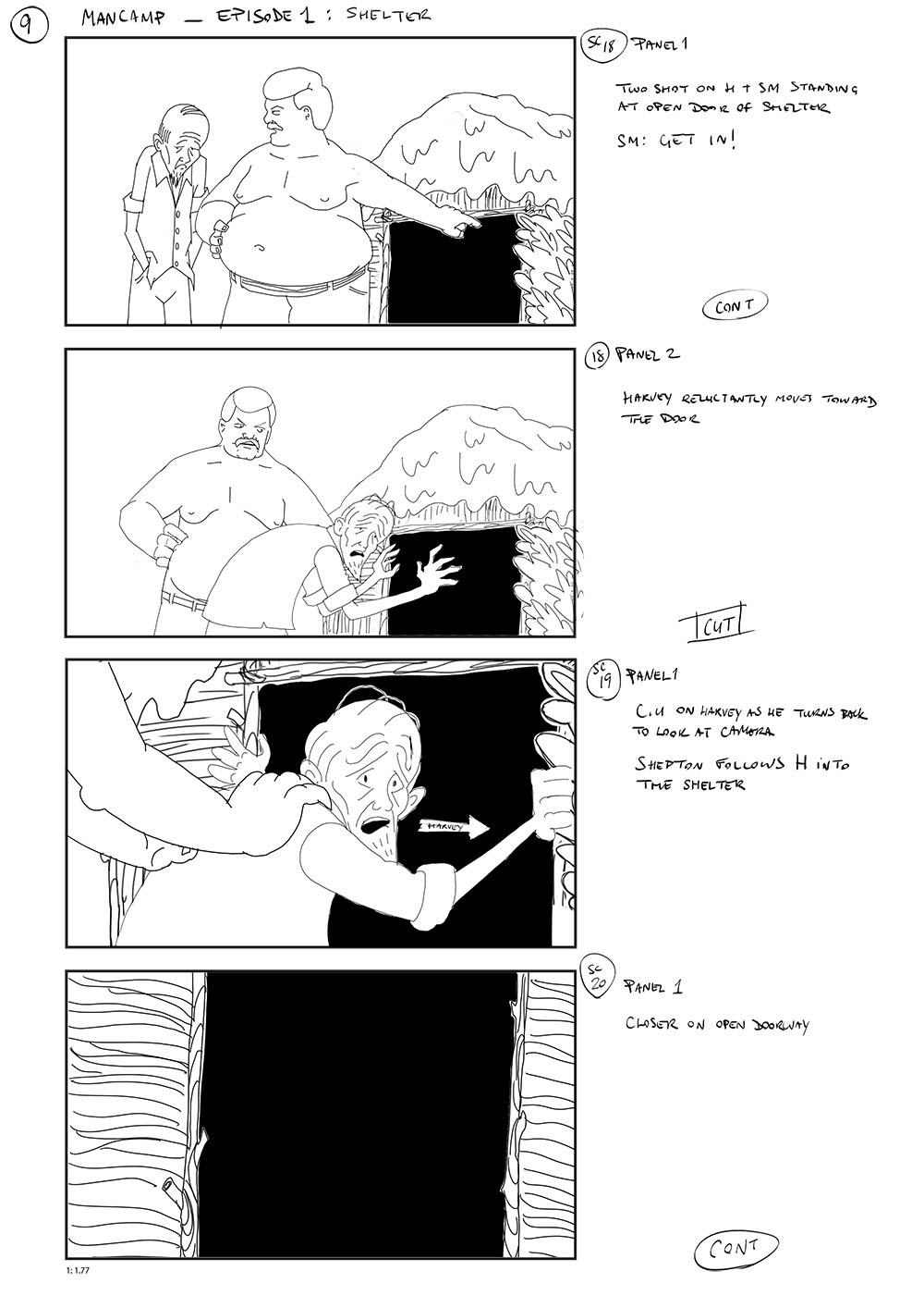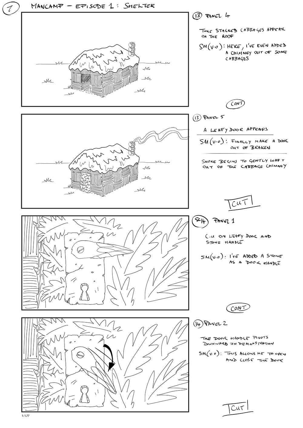 Sample boards for an adult comedy animation pitch lampooning survival shows like those of Bear Grylls and Ray Mears