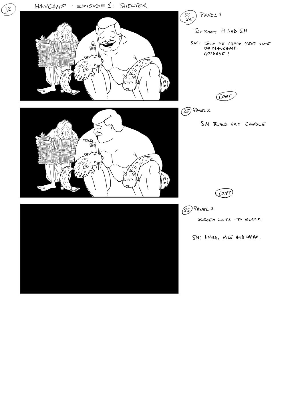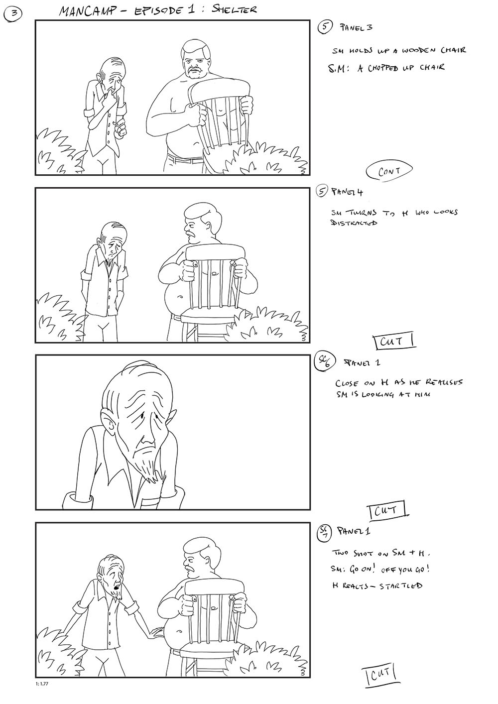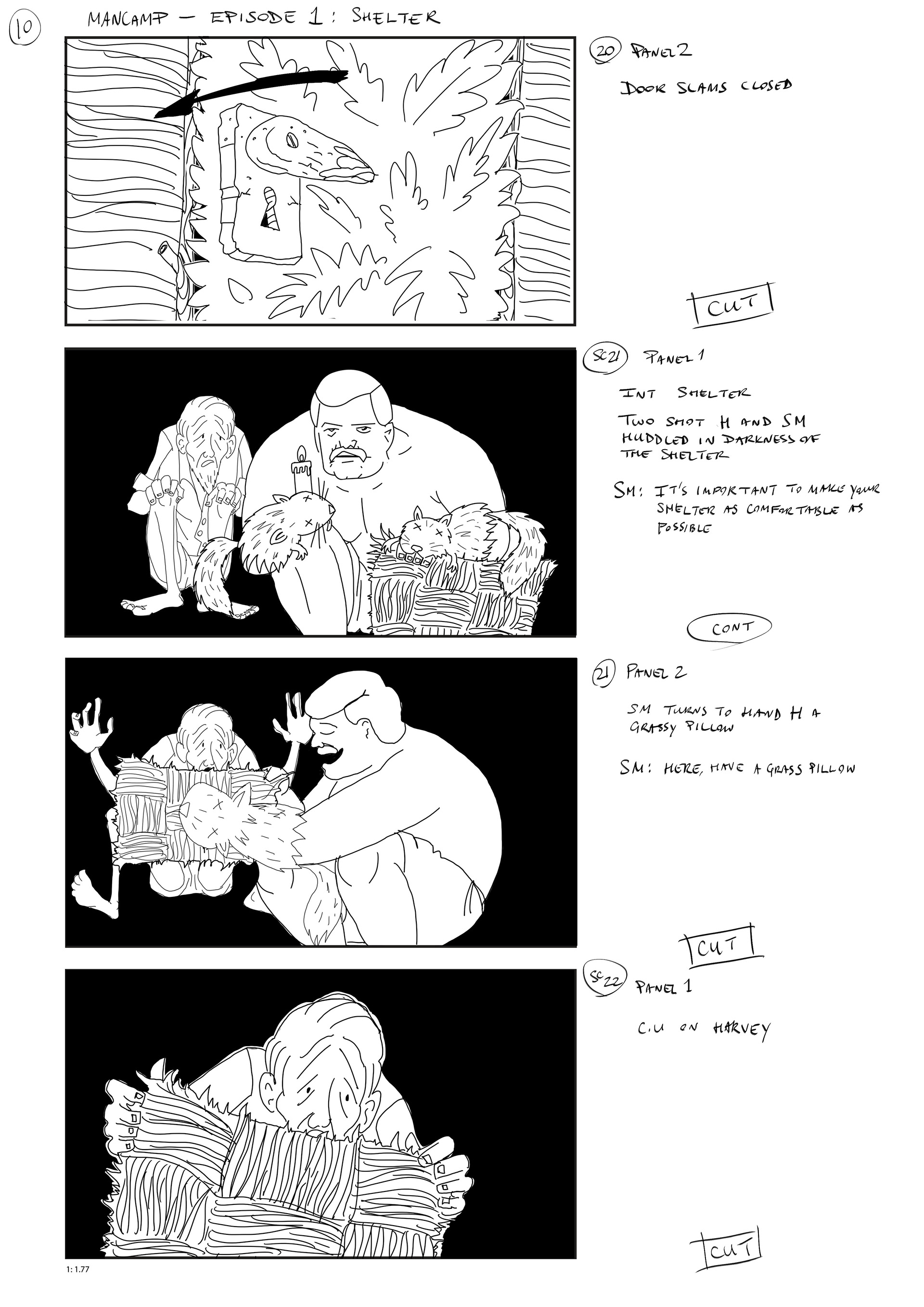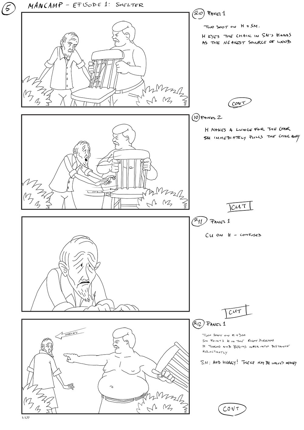 Sample boards for an adult comedy animation pitch lampooning survival shows like those of Bear Grylls and Ray Mears
