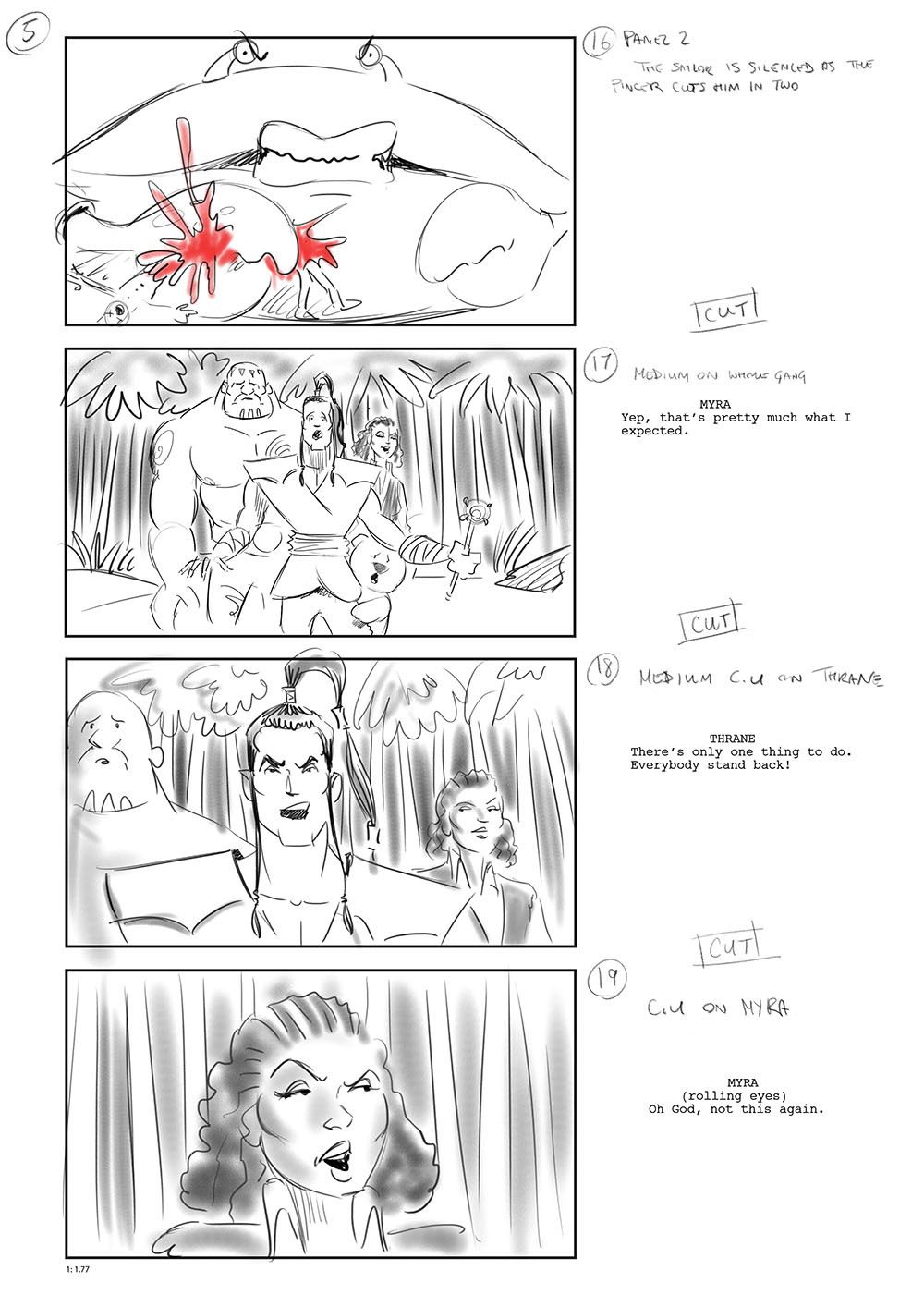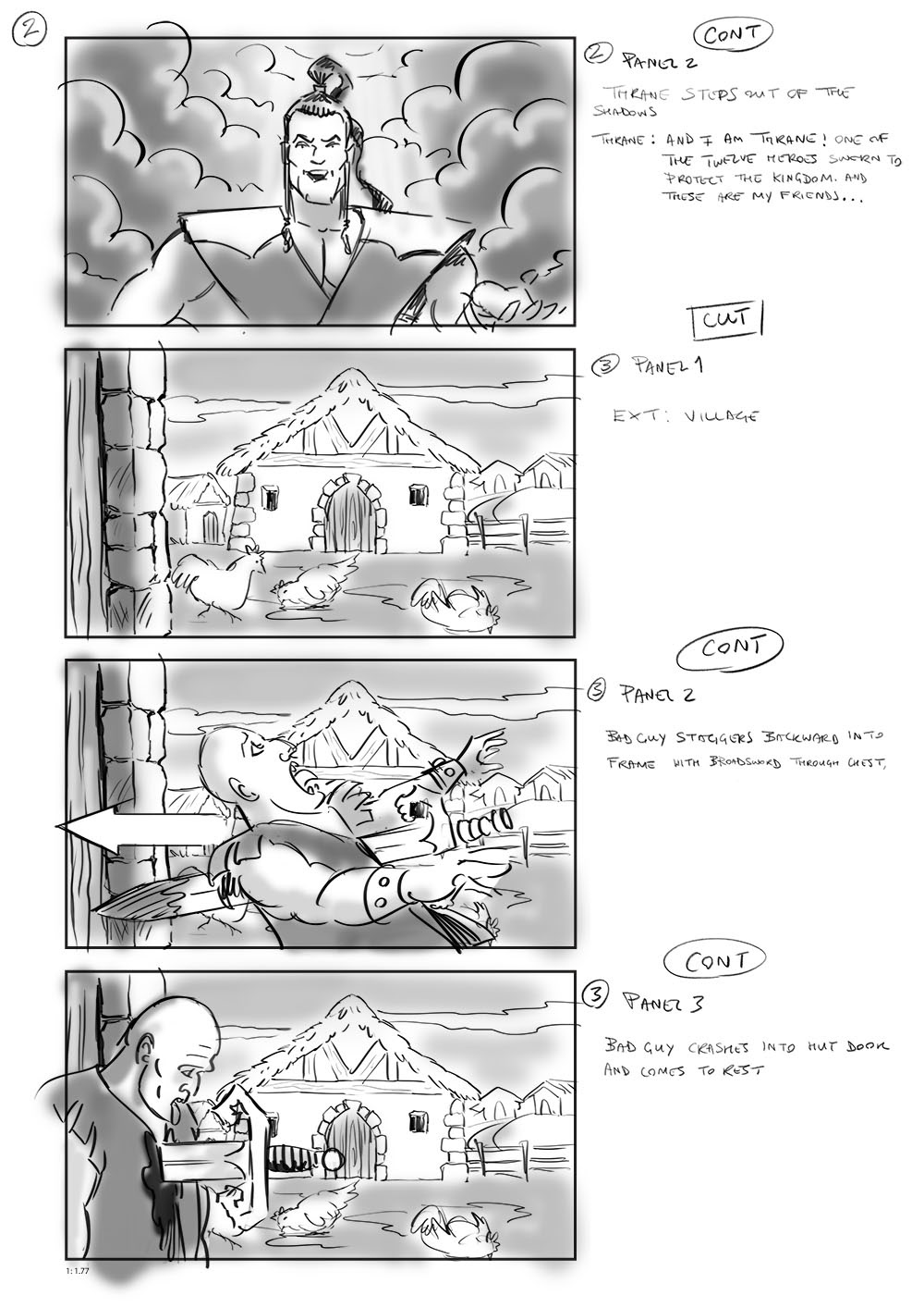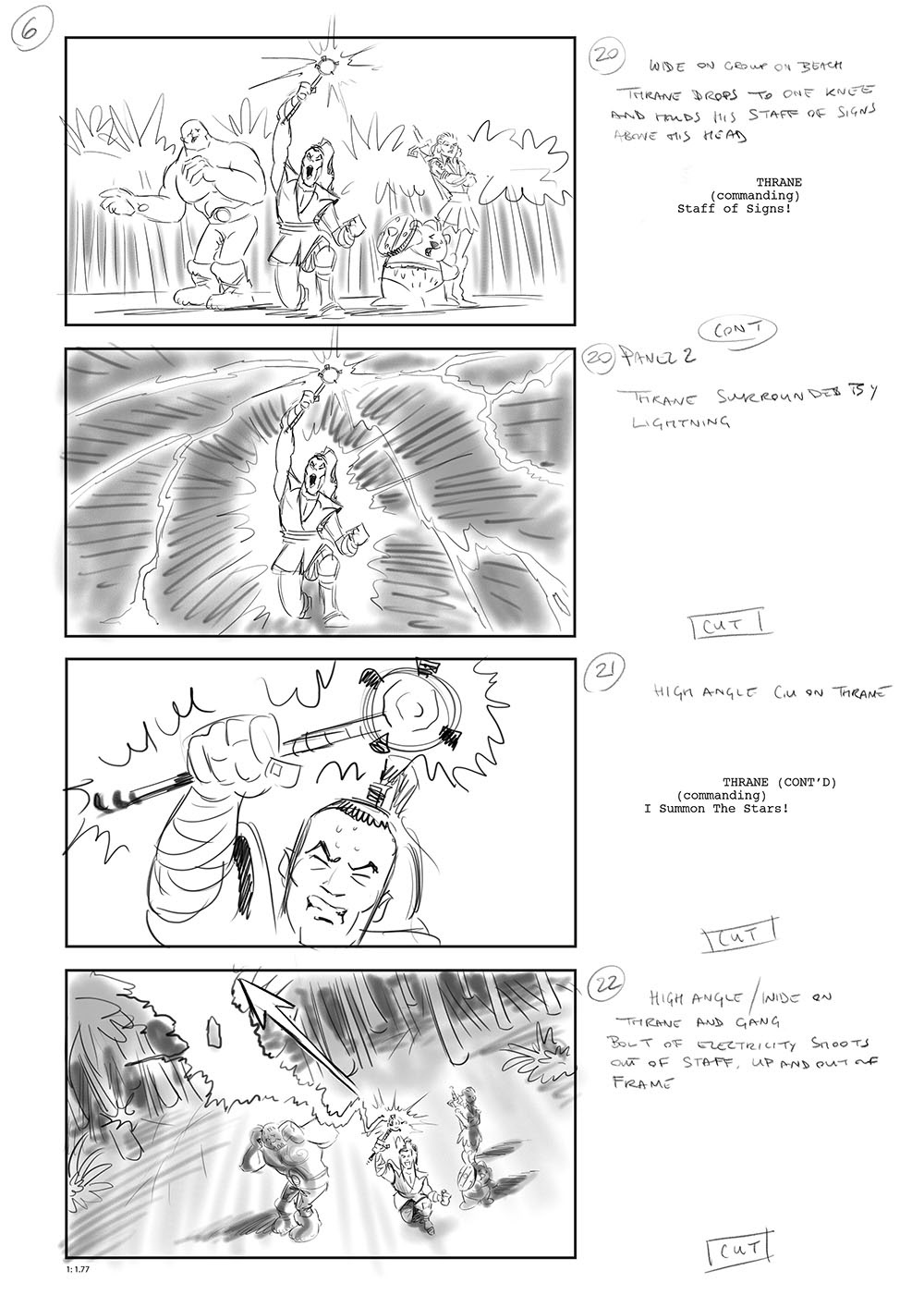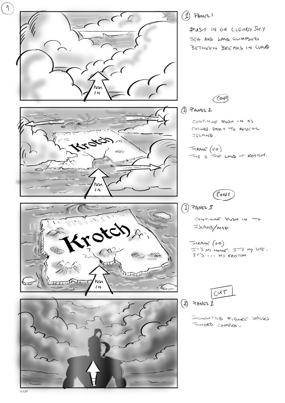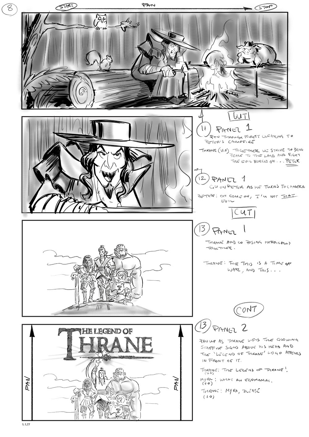 Storyboard sample for the title sequence of proposed animated fantasy/comedy series The Legend of Thrane created by Chris Hayward