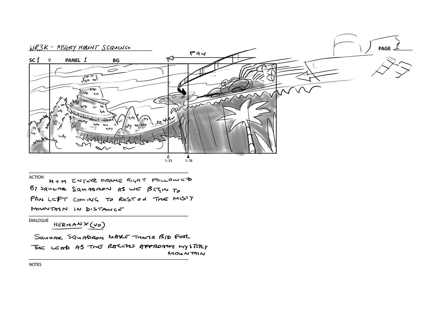 Sample storyboards for proposed children's animated comedy series Warprace 3000 created by Henry Coate and Chris Hayward. A kind of "Wacky Races in Space", this sequence follows the Tank driving 'Squeak Squadron' as they run into difficulties whilst racing through a mysterious Jungle Planet.